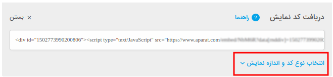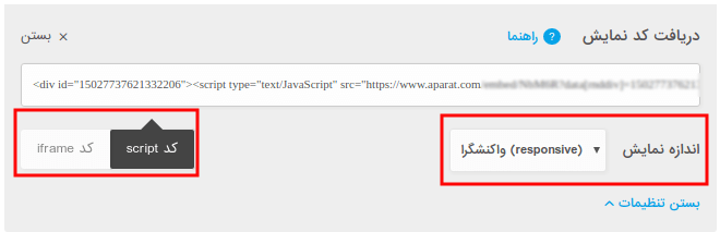 حالا اگه بخوایم نوع کد خودمون رو عوض کنیم دو نوع کد وجود داره (script)و(iframe) که میتونیم هر کدوم از اینها رو انتخاب کنیم برای انتخاب نوع کد و تغییر اندازه نمایش و… باید بر روی گزینه انتخاب نوع کد و اندازه نمایش و پنجره مشابهی مانند تصویر زیر برای ما باز میشه ابتدا نوع کد خودمون رو انتخاب میکنیم و حالا شخصی سازی دلخواه خودمون رو براش اعمال میکنیم و در نهایت کدی که در باکس برای ما نمایش داده شده را کپی میکنیم که در پست خودمون ازش بتونیم استفاده کنیم.