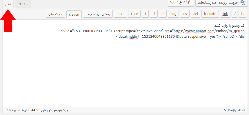 خب بعد از کپی کردن کد به یکی از پست های خودتون بروید و در قسمت متن کد را اضافه کنید مانند تصویر: