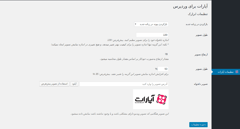بعد از نصب فعالسازی افزونه آپارات یک بخش جدید به نام تنظیمات آپارات برای ما ایجاد خواهد شد بر روی این بخش کلیک میکنیم و تنظیمات افزونه رو انجام میدیم تا افزونه برای ما به خوبی کار کنه. همانطور که در تصویر مشاهده میکنیم تنظیمات افزونه بر اساس نیاز های خودمون تنظیم شده و ما هر نیازی داشته باشیم از افزونه میتونیم از تنظیمات اون برای سفارشی سازی استفاده کنید.