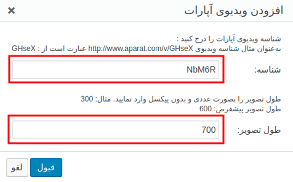بعد از کلیک کردن بر روی دکمه دیکر لازم نیست کدی را مثل قبل کپی کنید و انرا در پاراگرف متن بگذارید. بعد از کلیک کردن بر روی دکمه اپارات مانند تصویر زیر یک پنجره برای ما باز میشود و شناسه و طول تصویری از ما میخواهد که شناسه همان اخر لینک ویدیو آپارات هست و طول تصویر هم مقدار دلخواهی وارد کنید.