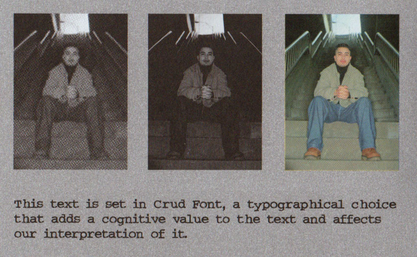 فهمیدن، شناختن یا تفسیر کردن بر اساس آنچه دریافت، آموخته یا استدلال شده است. تفسیر ادراکی یک تصویر بستگی به چگونگی ارائه ی آن دارد. سه تصویر بالا با تغییراتی، مردی را نشان می دهد. اما همانطور که نحوهی ارائه ی تصویر تغییر می کند، تفسیر ما نیز از آن مرد عوض می شود. تصویر اول (راست) درخشان و رنگی است و مرد به نظر بی خطر می رسد، ولی وقتی همین تصویر به صورت سیاه و سفید و تیره (وسط) چاپ می شود، ما آن را به گونه ای متفاوت و احتمالا شرورانه تر تعبیر می کنیم. تصویر سوم (چپ) با ترام درشت و نیم سایه های متنوع چاپ شده است. آیا به این ترتیب مرد به نظر دوستانه می رسد یا خصمانه؟ متن زیر با قلم crud چیده شده که بر ارزش ادراکی متن می افزاید و بر تفسیر ما از آن تأثیر می گذارد.