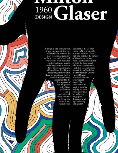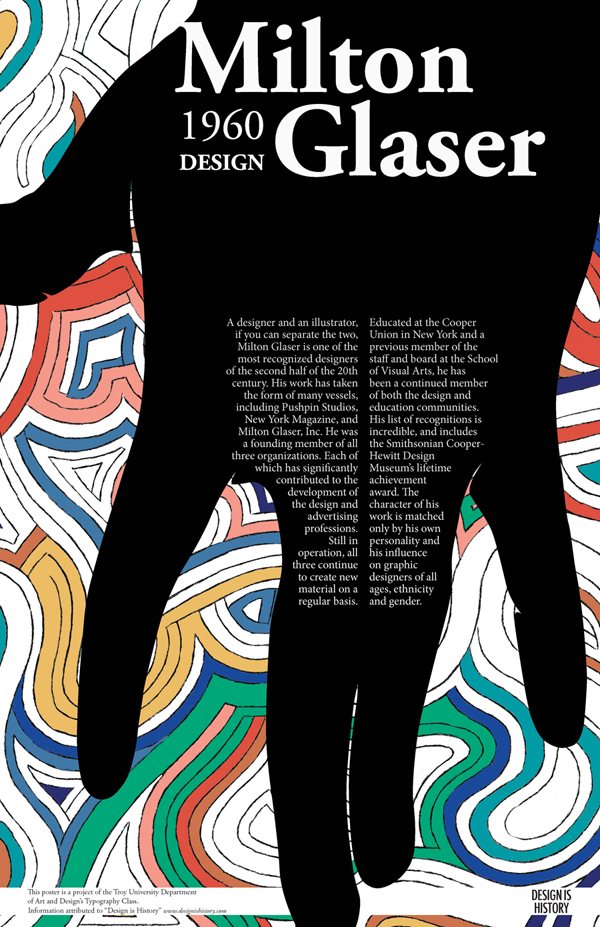 برای خیلیها نام «میلتون گلیزر» مترادف با گرافیک دیزاین آمریکایی است. او از بنیانگذاران استودیوی تحولآفرین «پوشپین» در سال ۱۹۵۴، یکی از مؤسسین مجلهی نیویورک به همراهی کلی فلکر در ۱۹۶۸، بنیانگذار مؤسسهی میلتون گلیزر در ۱۹۷۴، و طراح لوگوی معروف “I♥NY” یا همان «آی لاو نیویورک» در ۱۹۷۷ است. مشخصه ی بارز آثار او استفاده از متن در طراحیهایش است.